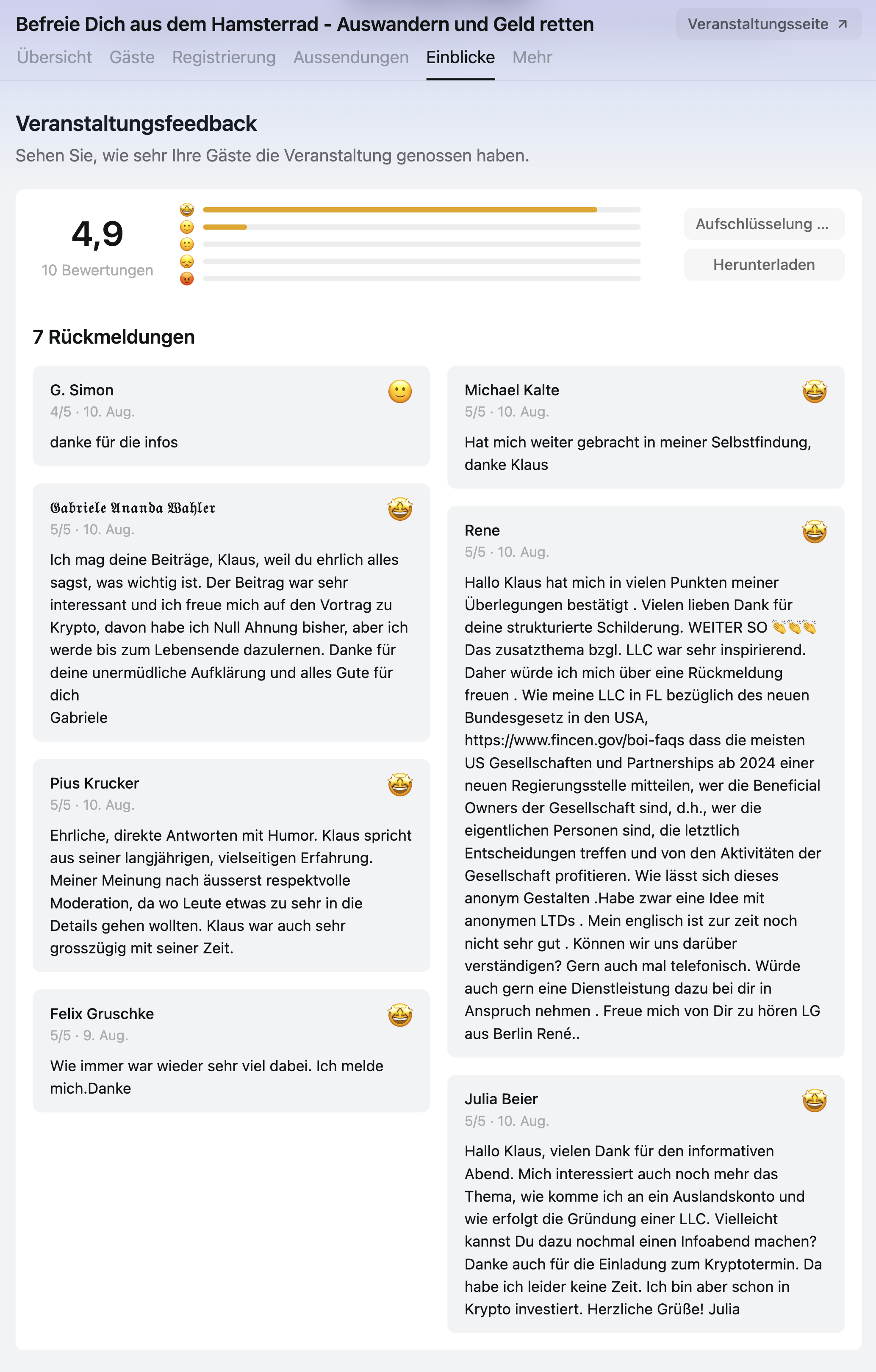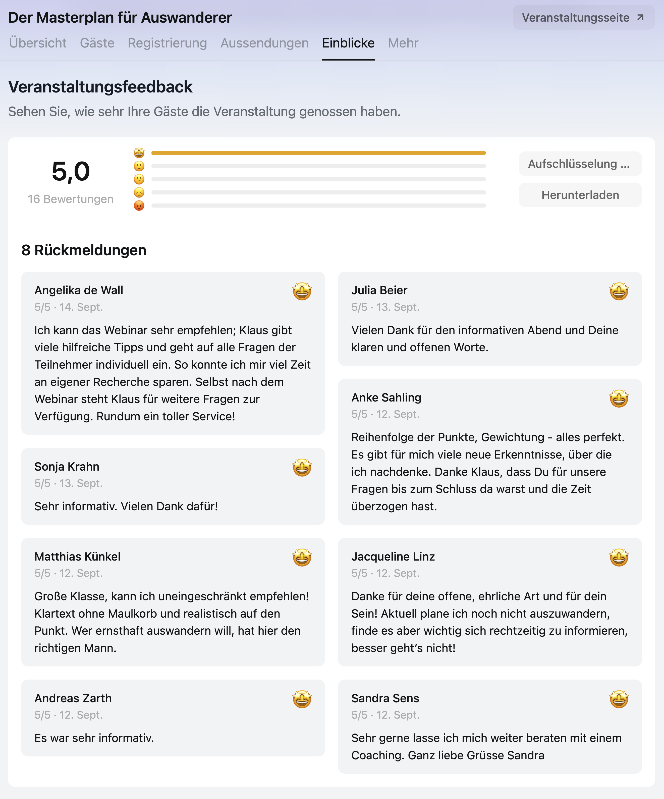 Meine Veranstaltungen gehören zu den bestbewerteten Webinaren im Internet und werden regelmäßig mit Bestnoten durch die Teilnehmer ausgezeichnet.