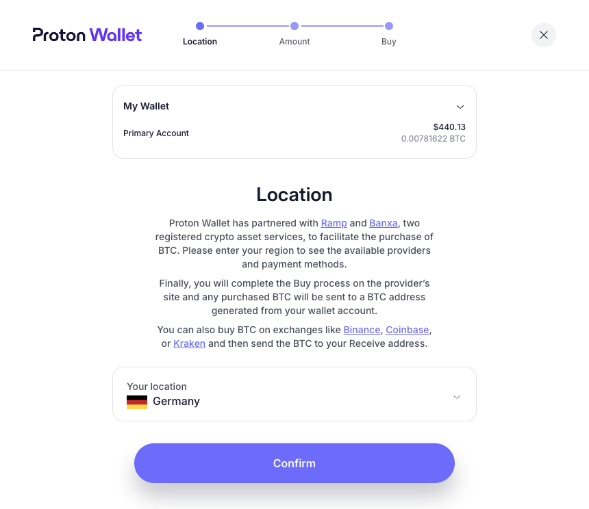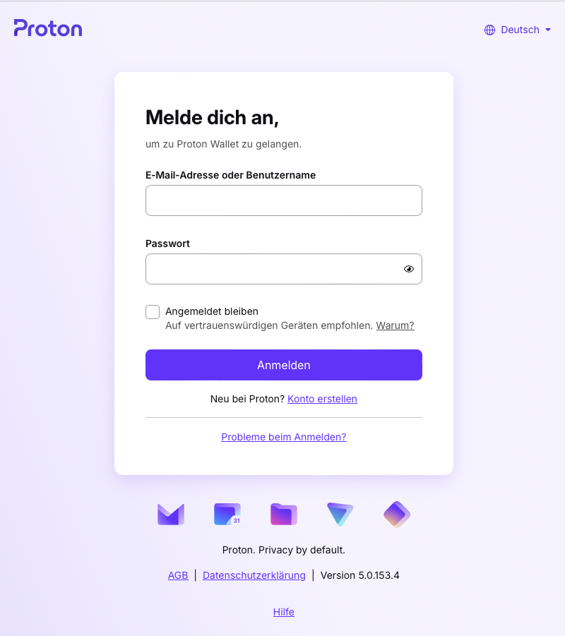Proton Wallet kann ganz einfach im Webbrowser und auf iOS und Android genutzt werden. Hier der Log-in-Screen im Webbrowser: