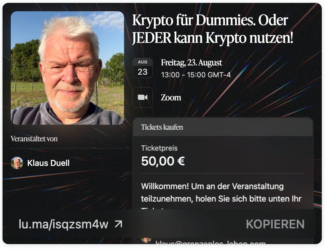 Deswegen ist es im Jahr 2024 unverzichtbar, sich mit Krypto zu beschäftigen – auch wenn man es wie ich kritisch sieht. Auf vielfachen Wunsch beschäftige ich mich am 23.08.2024 von 19:00 – 21:00 MESZ in der Veranstaltung Krypto für Dummies. Oder JEDER kann Krypto nutzen! mit diesem Thema. Hier kannst Du Dich anmelden: