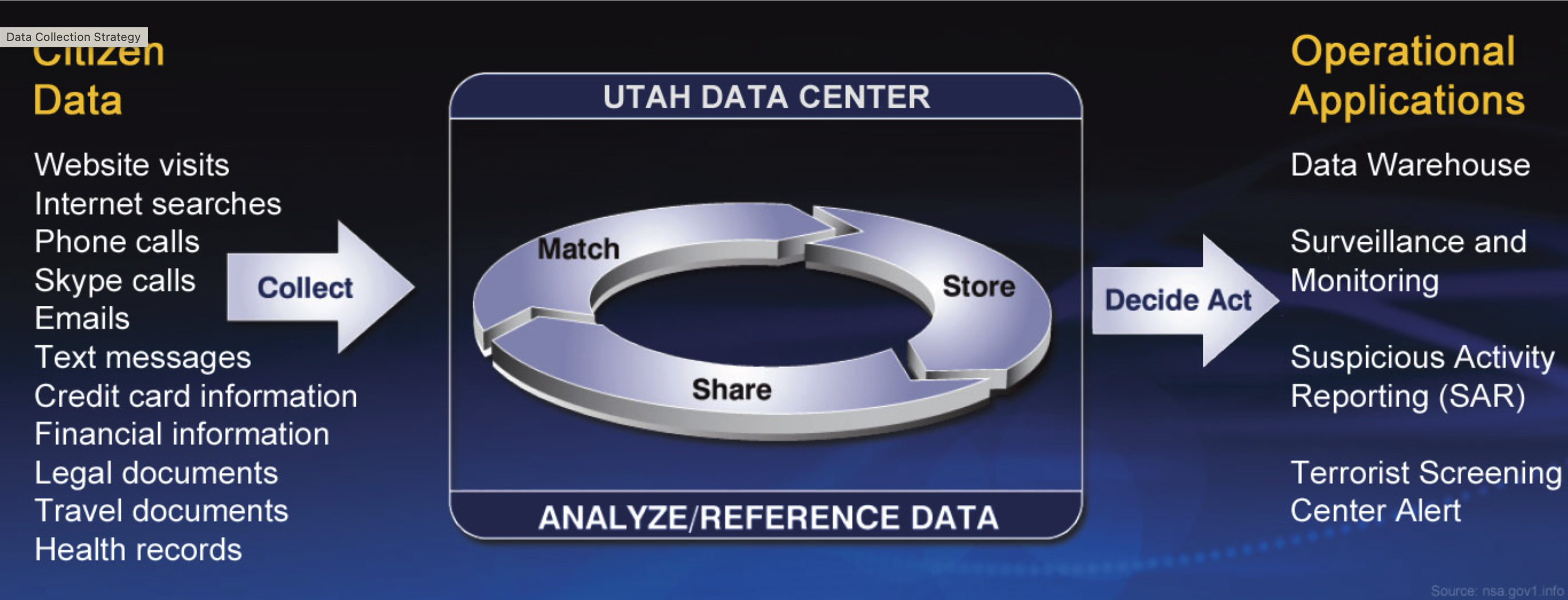 There is no way to predict in advance which crucial piece of data will be the key to revealing a potential plot. The standard operating procedure for the Domestic Surveillance Directorate is to “collect all available information from all available sources all the time, every time, always”.