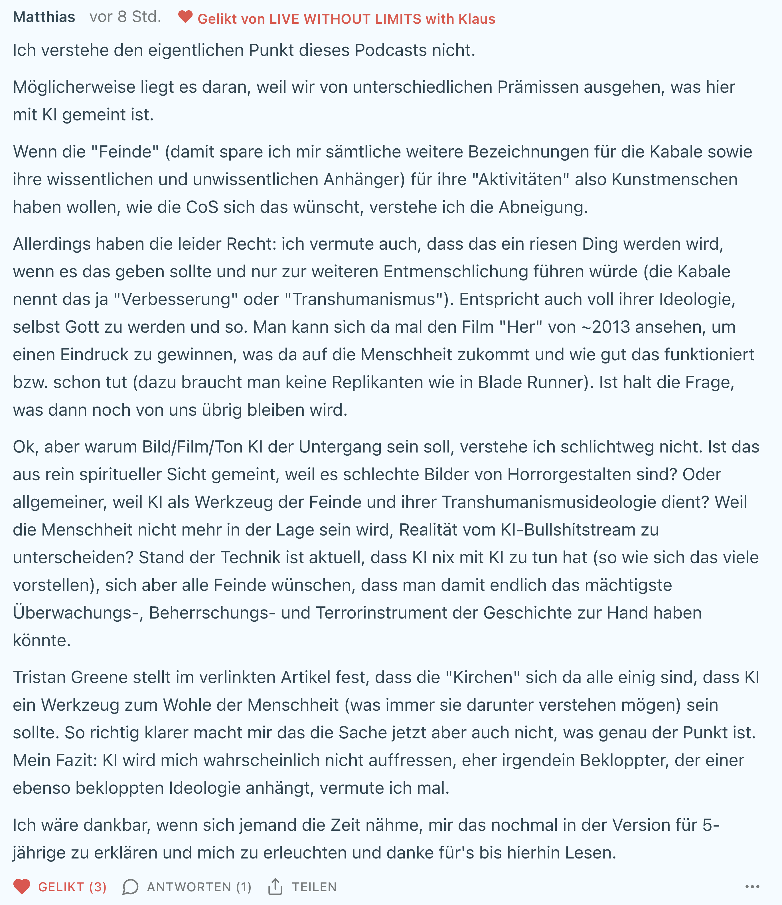 All dies habe ich so unter dem Podcast 210 geschrieben. Und ich wiederhole es ganz bewusst. Der Podcast hat viele Kommentare angeregt, was mich freut.