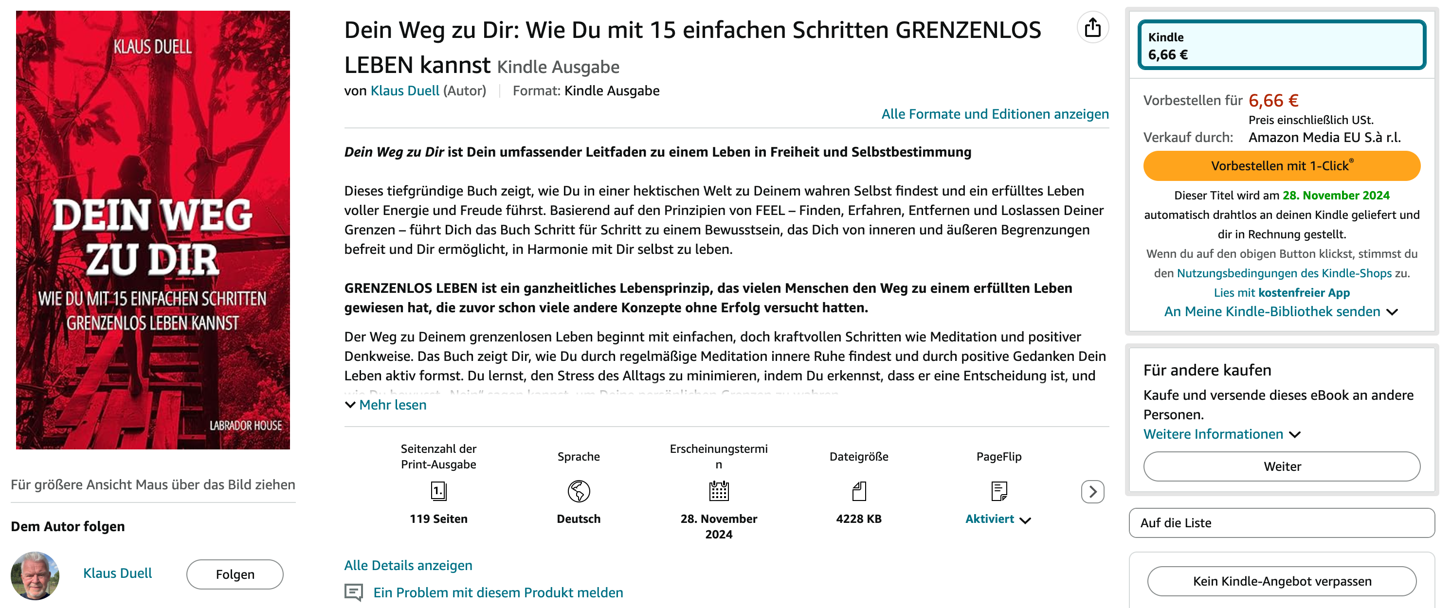 Du kannst Dich bis zum 27.12.2024 23:59 registrieren, danach ist das Angebot beendet. Mit der Registrierung erwirbst Du das Buch nicht, das Buch kannst Du nur selbst auf Amazon kaufen. Schicke mir bitte ein Foto Deines Buches an info@grenzenlos-leben.com von der Email-Adresse, mit der Du Dich für das Geschenk registriert hast und ich sende Dir das Geschenk vor Weihnachten. Danke!